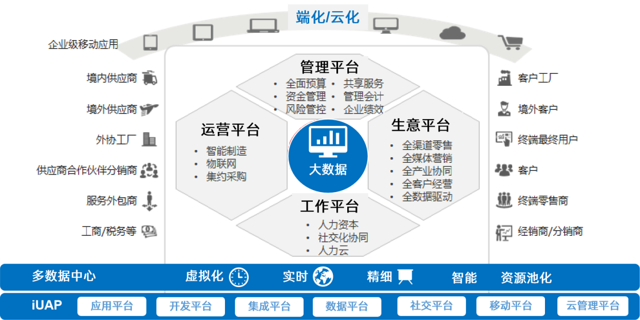 用友NC全面助力大型企业互联网化的转型升级,帮助企业建立以“客户”为核心的数字化营销生意平台、以“物”为核心的供应链与制造管理运营平台、以“财”为核心的集团管控平台、以“人”为核心的人力资本管理与共享协同工作平台、以技术为核心的大型企业与组织计算平台,可以真正聚焦企业战略、透视经营、专业化分工、多组织协同运作、精细化管理等,实现企业的降本增效。