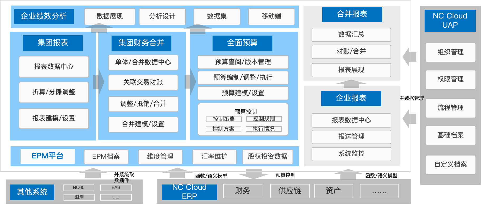 NC Cloud 企业绩效管理以全面预算、报表、企业绩效分析为核心为大型企业数字化转型提供服务,助力企业打造业财一体化的企业绩效管理平台。通过实时分析、调整和预测帮助企业管理层有效洞察和理解运营数据,为集团的决策提供强有力的数据支撑,赋能管理。