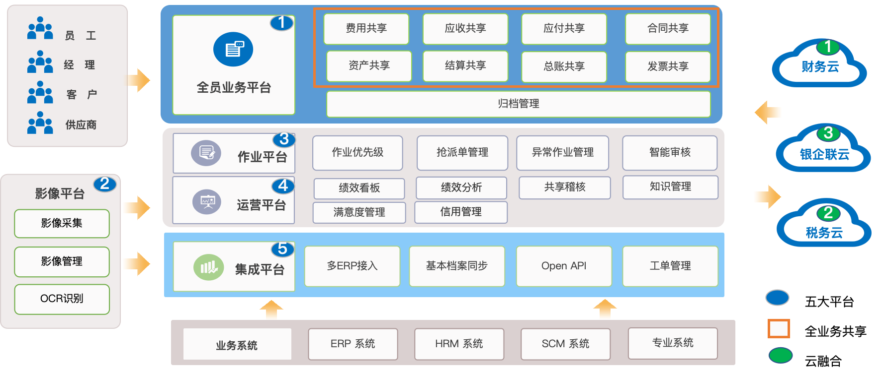NC Cloud 全新推出业财税一体化、全业务共享解决方案,提供全员业务平台、影像平台、作业平台、运营平台、集成平台、发票中心,支撑费用共享、应收共享、应付共享、合同共享、资金共享、资产共享和总账共享;并与供应链、资产管理等业务系统无缝集成,支持与异构系统集成。共享服务实现平台化、全员应用、全业务共享、全程管控,满足企业高可用、高并发的业务需求。