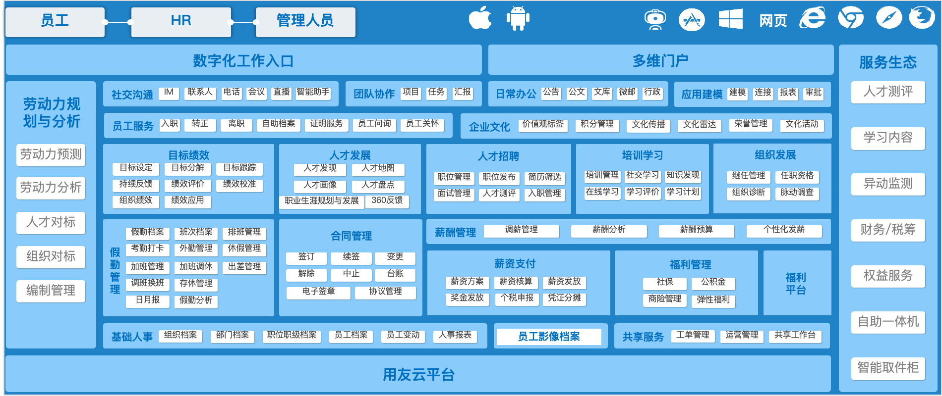 用友人力资本管理产品为国内外大中型集团企业及各类组织提供基于国际化架构下的全生命周期人力资本管理解决方案,包括面向多组织集团的人力资源集团管控、核心人力资源管理、基于流程的精细化劳动力管理、以持续绩效、人才继任、人才盘点等为核心的人才管理。