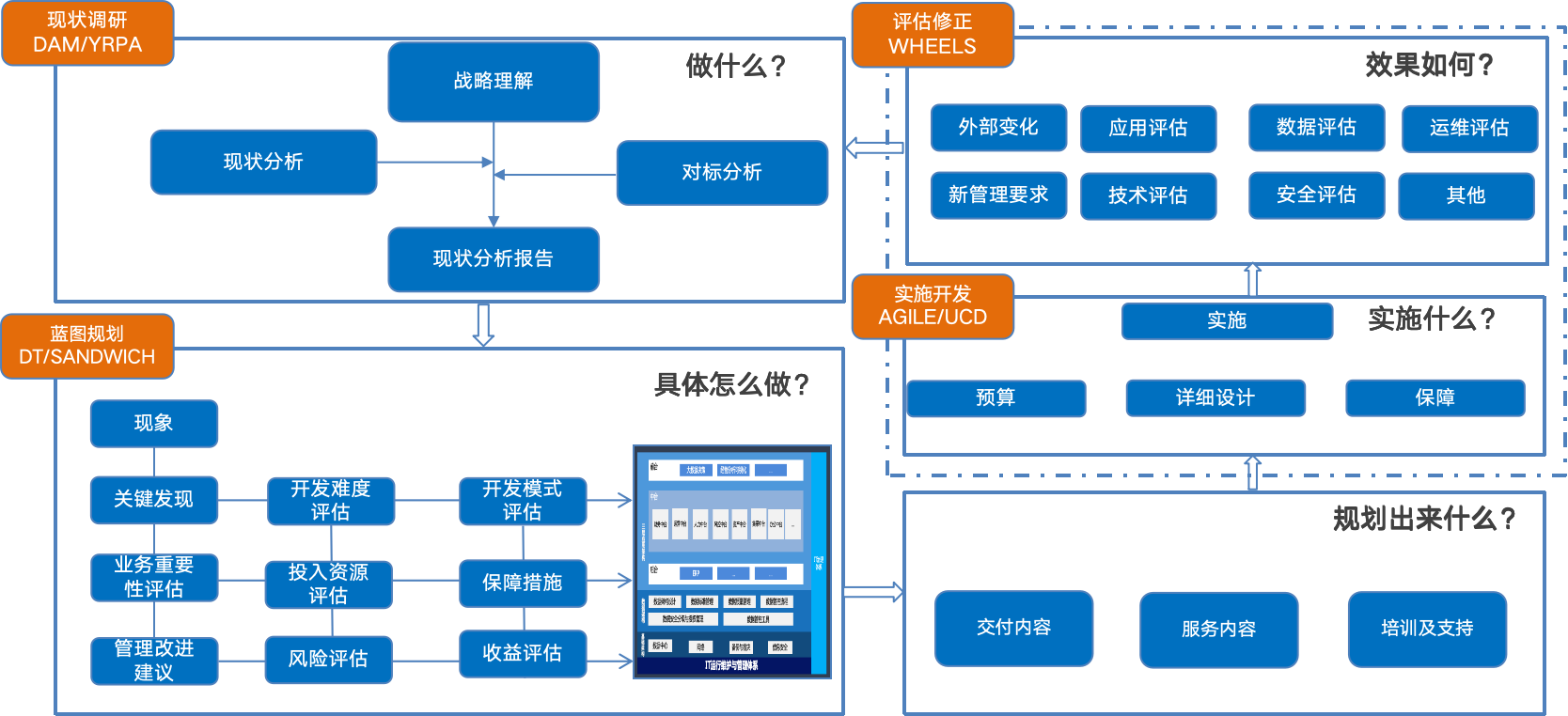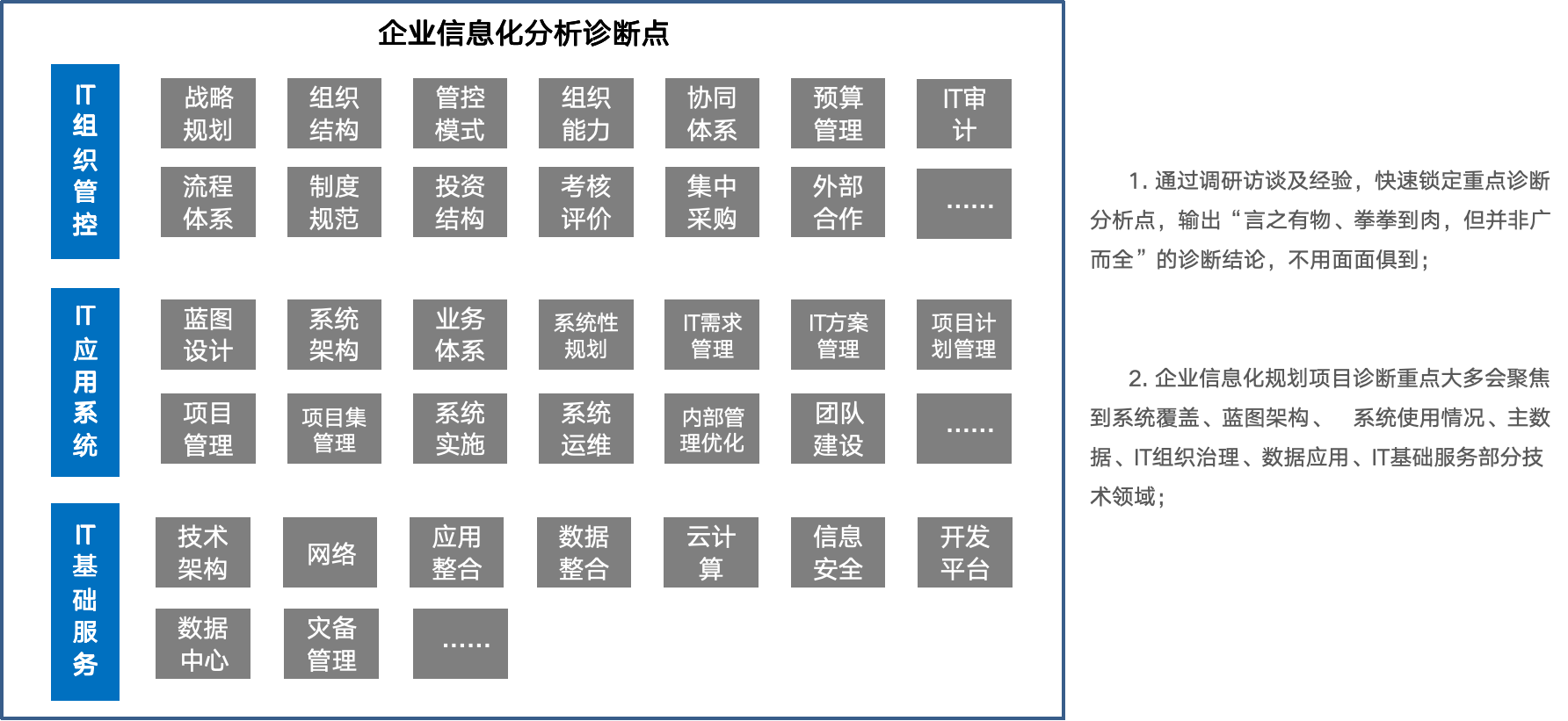 围绕企业顶层战略规划及业务发展目标,结合企业业务运营信息化现状,辅助数字化部门规识别现有短板及优化项,结合实际落地经验,为企业规划合理的IT建设规划及分期