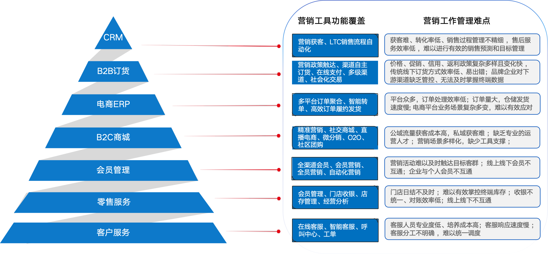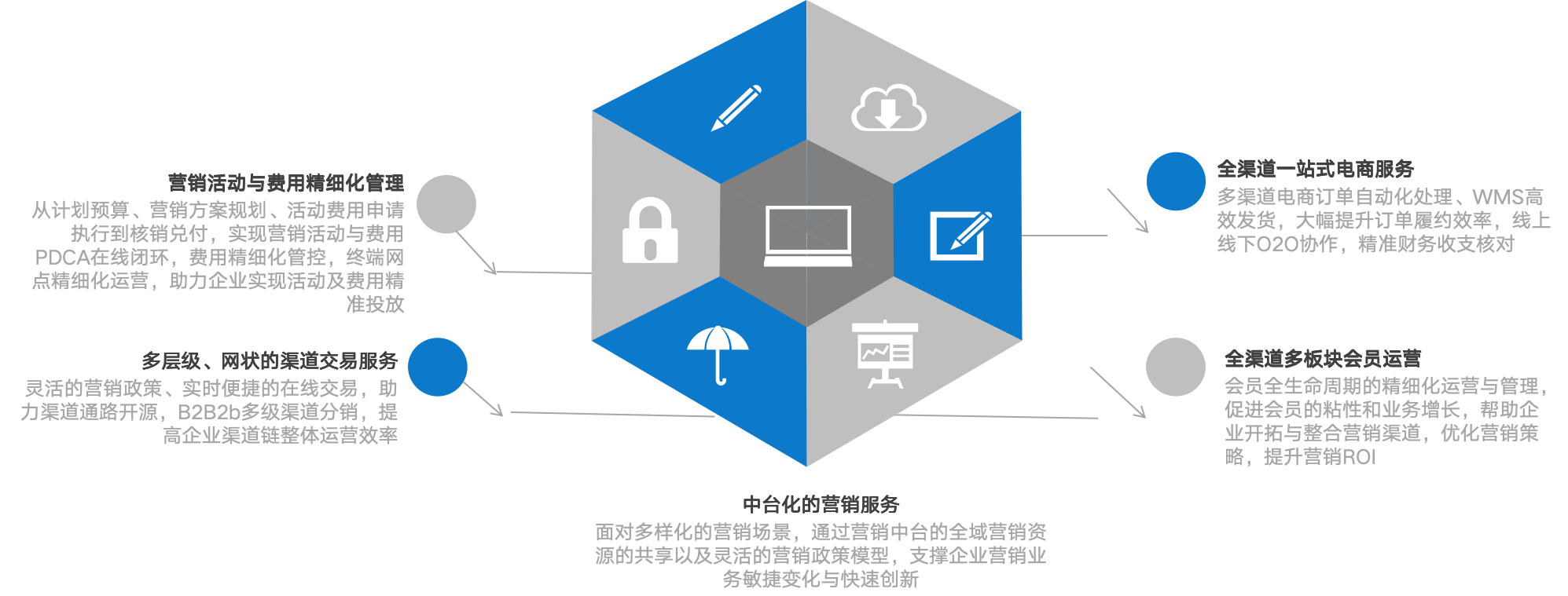 数字化营销体系,实现打通企业-经销商-分销商-终端门店全链路的销售业务共享、营销活动开展与投放管理、提升企业综合服务能力。 通过数字化营销,实现 B2B,B2B2b,B2C全渠道多级多端交易协同管理,提升企业订单交易处理效率,提升企业品牌影响力。