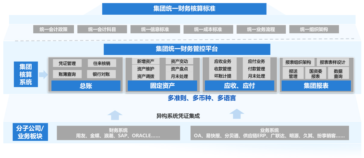 集团财务管控平台建设,实现统一应用、统一维护,规范财务系统业务流程,统一会计科目体系,实现集团“一本账”、“一套标准”,满足财务管理需求,提供财务核算效率与质量