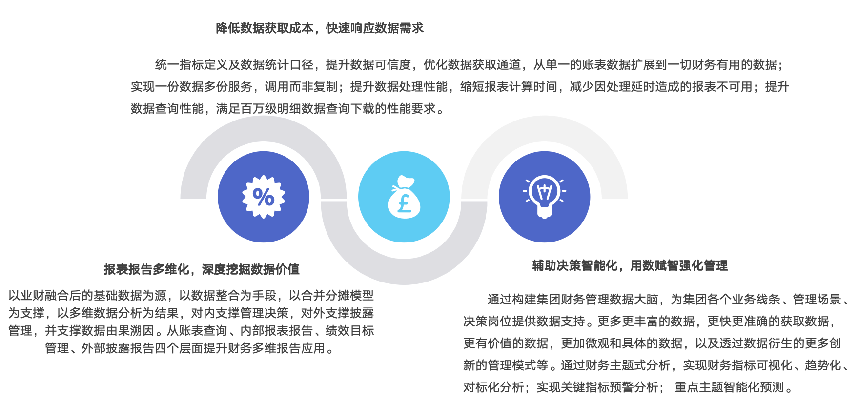 将线下报表报告等数据工作(如管理架构合并、区域情况统计、三年三期数据表、管理口径快报等)通过智能财务分析系统实现线上化应用,支撑多套管理口径报表合并、多维对比分析报告生成等,解放人工数据加工工作,提升数据可用性,发挥财务数据挖掘能力;