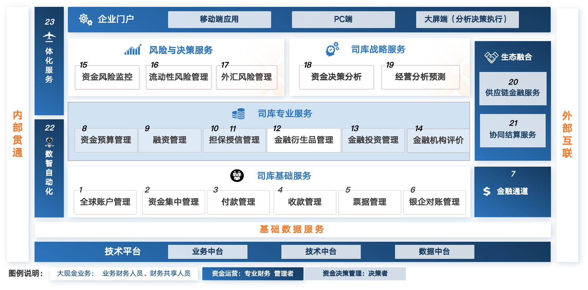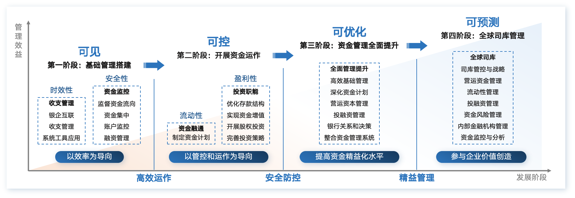 从资金管理到司库管理 资金发展经历了可见、可控、可优化、可预测四个阶段。如今,越来越多企业开始把财资管理放到“大的司库管理框架”之内进行审视和管理,在经济全球化、互联网+、数字化转型的大背景下,企业的资金管理发生着变革和拓展。资金管理已经从最开始的基础资金管理发展到资金集中管控时代,再到现在的司库时代,企业的财资管理已经不是在后台,而是成为企业最重要的战略支撑。未来集团企业将以全球司库的管理理念,构建企业资金管理体系,统筹金融资源,实现资金高效运作、安全防控、精益管理。