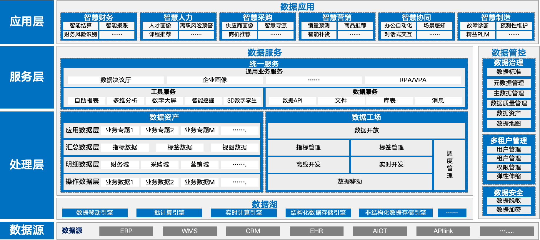 数据中台以全域数据应用为目标,提供数据治理、数据采集、数据建模、计算加工、资产的构建和共享、数据分析挖掘等能力,支撑企业在指标管理、分析展现、决策支持、知识发现、人工智能等数据驱动的各种场景应用。