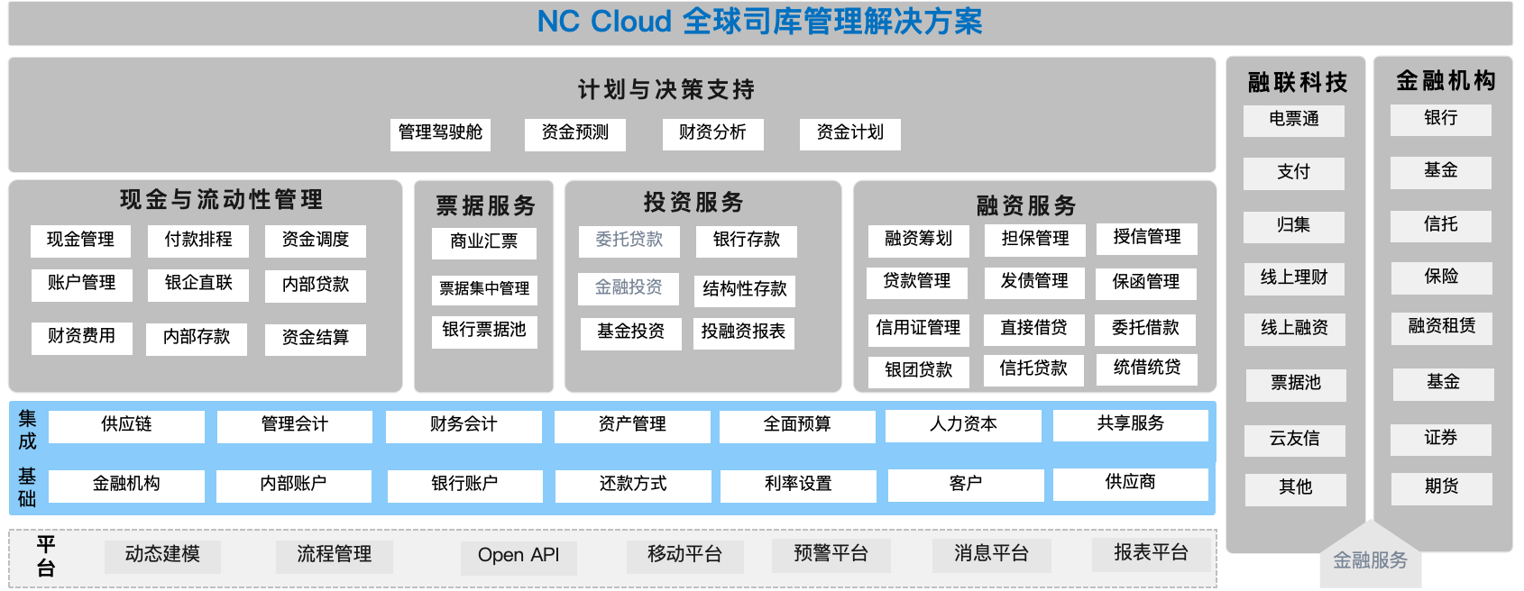 NC Cloud 财资管理打造决策+业务+集成平台整体解决方案,平衡企业现金流,预测风险;产品在功能上、灵活性、易用性、集成性、安全性、国际化方面有所提升,与财务共享实现一体化、与应收管理、应付管理实现一体化、与全面预算实现一体化,并对投资、融资、日常经营活动进行全方面管理。