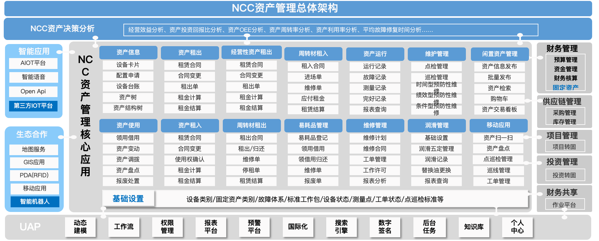 NC Cloud 资产管理是基于 NC Cloud 平台,整体构建的集团资产管理与设备资产维修维护管理产品,并与财务、采购、库存等产品一起,构成的企业管理完整解决方案。通过 NC Cloud 资产管理,帮助企业实现资产从建卡,最终直到报废处置的全生命周期过程管理。