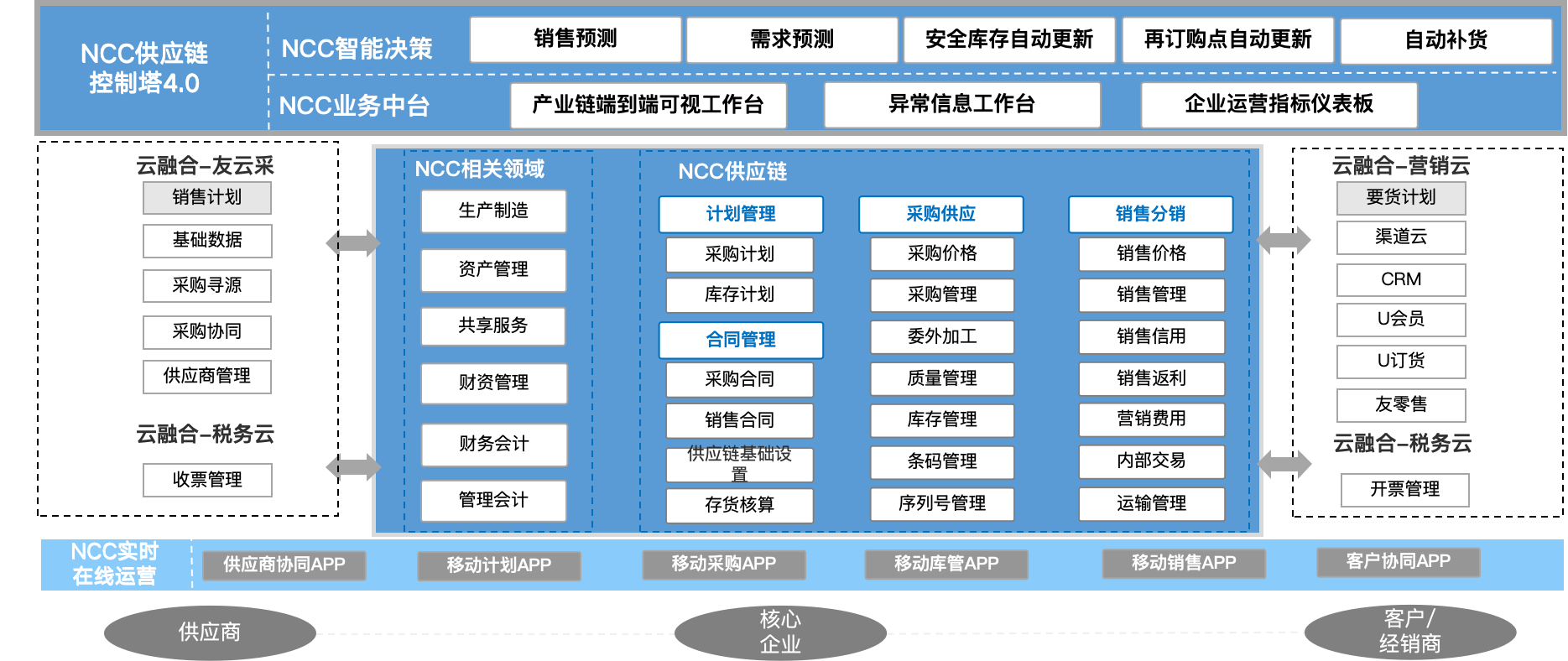 NC Cloud 供应链管理以场景化、角色化、轻量化的方式展示所有供应链应用。支持多组织环境下的各种跨组织应用供应链业务,并可以便捷支持由此引发的内部交易结算,支持供应链业务与财务、生产制造紧密集成。