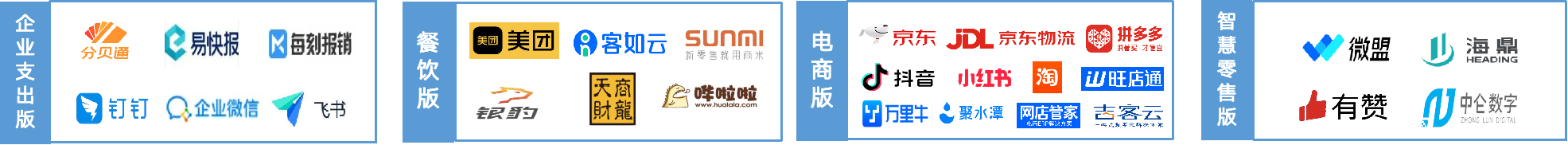 万联云已与50余家厂商进行打通,沉淀餐饮、零售、电商、OA及费控支出等多类业务系统接口及数据标准化转换能力,已经发布企业支出版、餐饮版、电商版、智慧零售版四个成熟版本,为企业系统集成提供低成本、高效率集成解决方案。