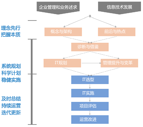围绕企业顶层战略规划及业务发展目标,结合企业业务运营信息化现状,辅助数字化部门规识别现有短板及优化项,结合实际落地经验,为企业规划合理的IT建设规划及分期