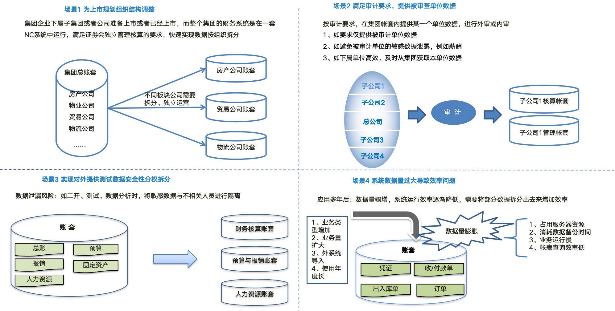 由于多种原因企业需要进行数据拆分隔离,华科可提供各类数据拆分服务如单位独立上市满足上市企业独立核算要求;如应对审计提供审计所需财务数据;如独立拆分部分非核心数据供业务测试或因为数据量激增导致的效率问题进行按年度拆分