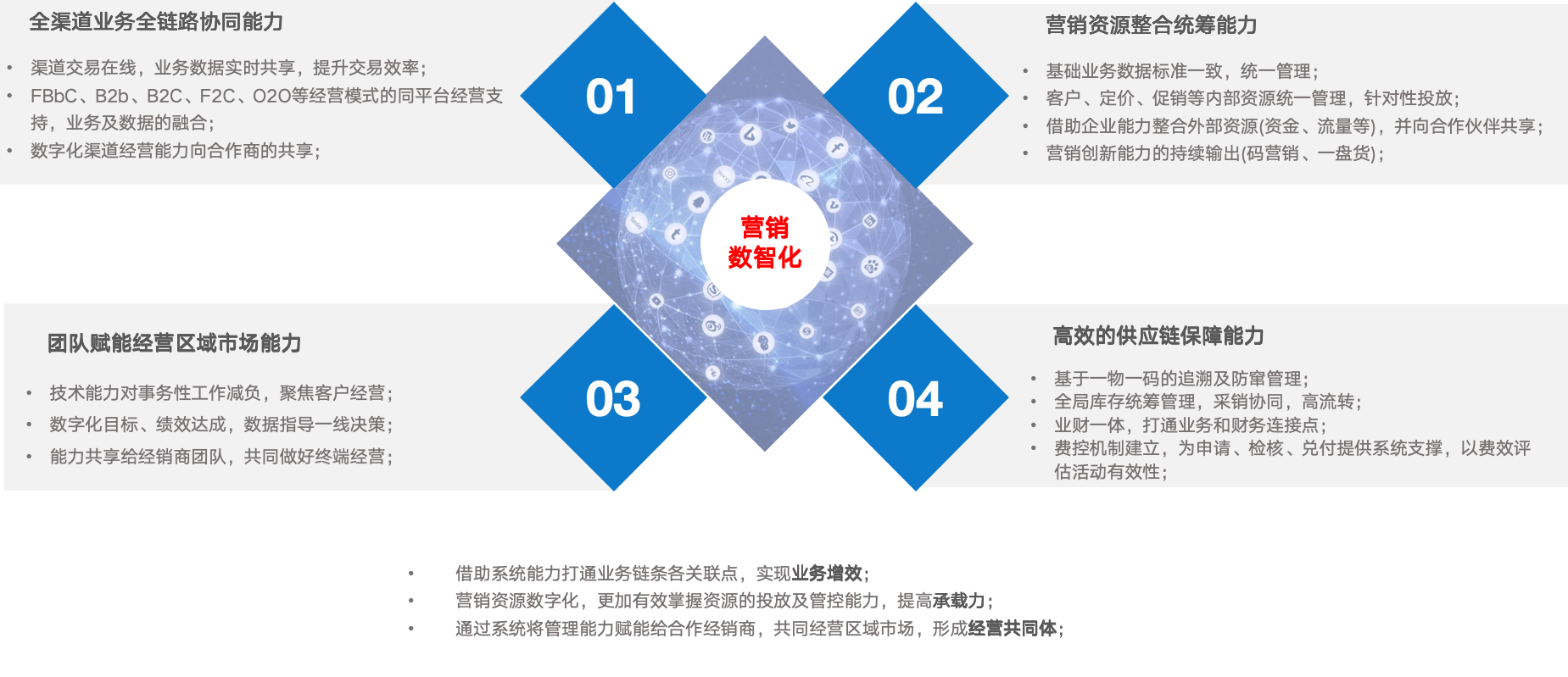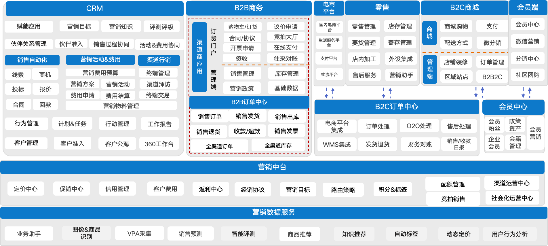 数字化营销体系,实现打通企业-经销商-分销商-终端门店全链路的销售业务共享、营销活动开展与投放管理、提升企业综合服务能力。 通过数字化营销,实现 B2B,B2B2b,B2C全渠道多级多端交易协同管理,提升企业订单交易处理效率,提升企业品牌影响力。