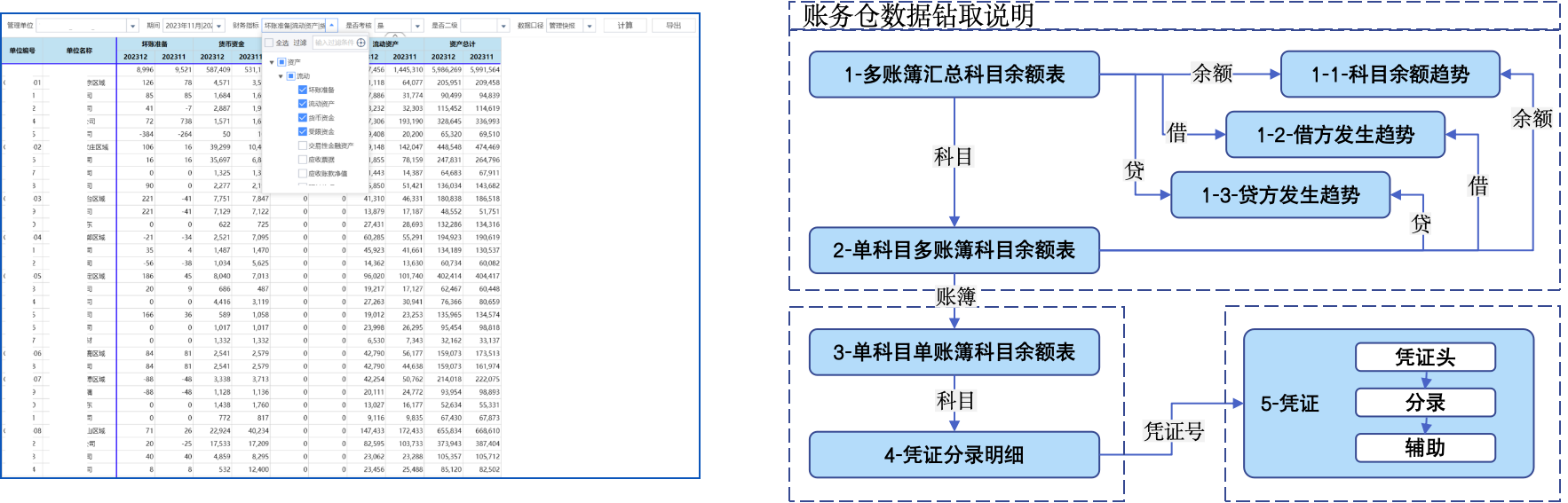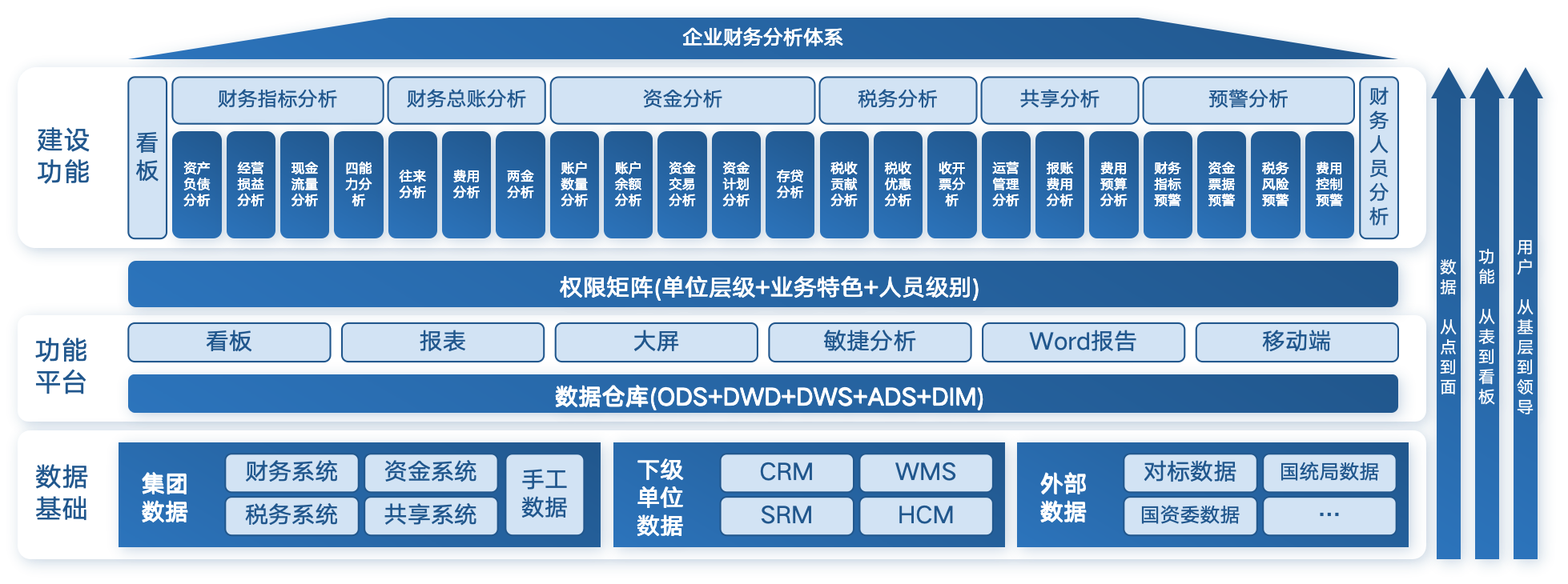 结合财务决策模型、风险监控模型等(EVA、杜邦分析、Z财务风险模型、财务杠杆风险、财务风险指标预警等) 为战略决策提供权威和专业的财务数据支撑;业务财务需要实现对详细财务指标从汇总到明细单据的层层钻取,监督指导业务执行;报表专员需要一套多维灵活的报表报告体系,实现面向不同口径的自助报表出具;资金等专业领域财务则需要在保持核心数据的独立性和安全隔离前提下,实现从余额监控到流量预测到债务预警等全面的主题分析和钻取挖掘。