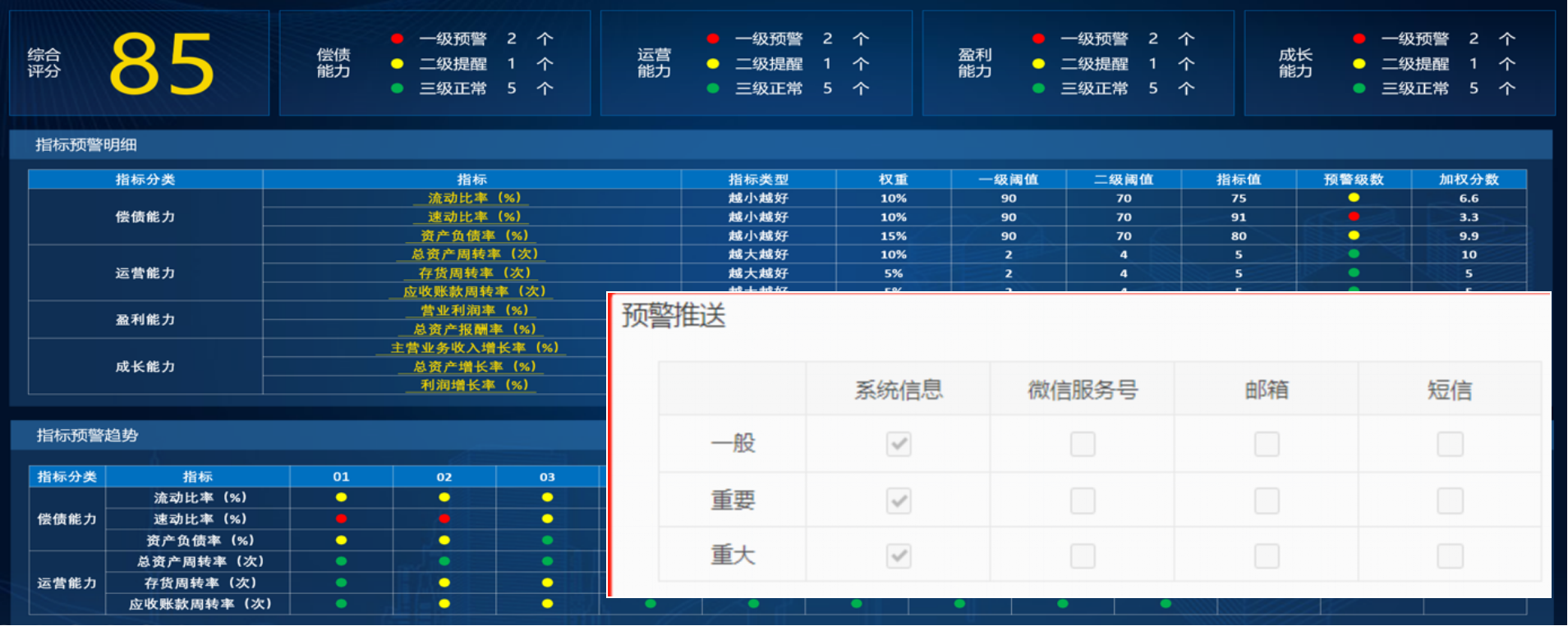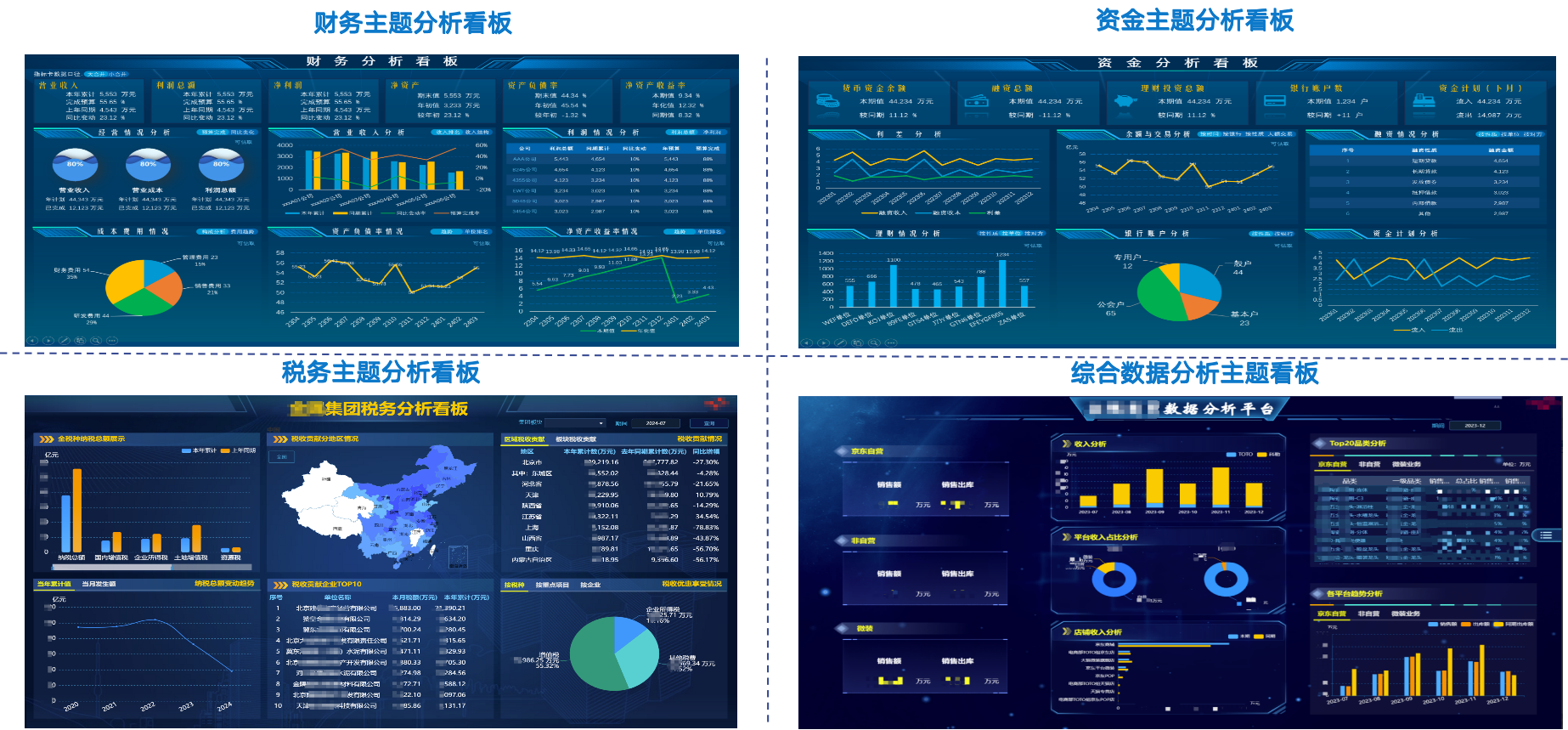 按照财务业务领域,划分财务主题、资金主题、税务主题、综合分析主题等,实现数据指标可视化、趋势化、对标化分析;实现包括四项能力分析、资金流动性分析、债务风险预警、国资委行业对标、上市公司对标等多个主题可视化、价值化分析;