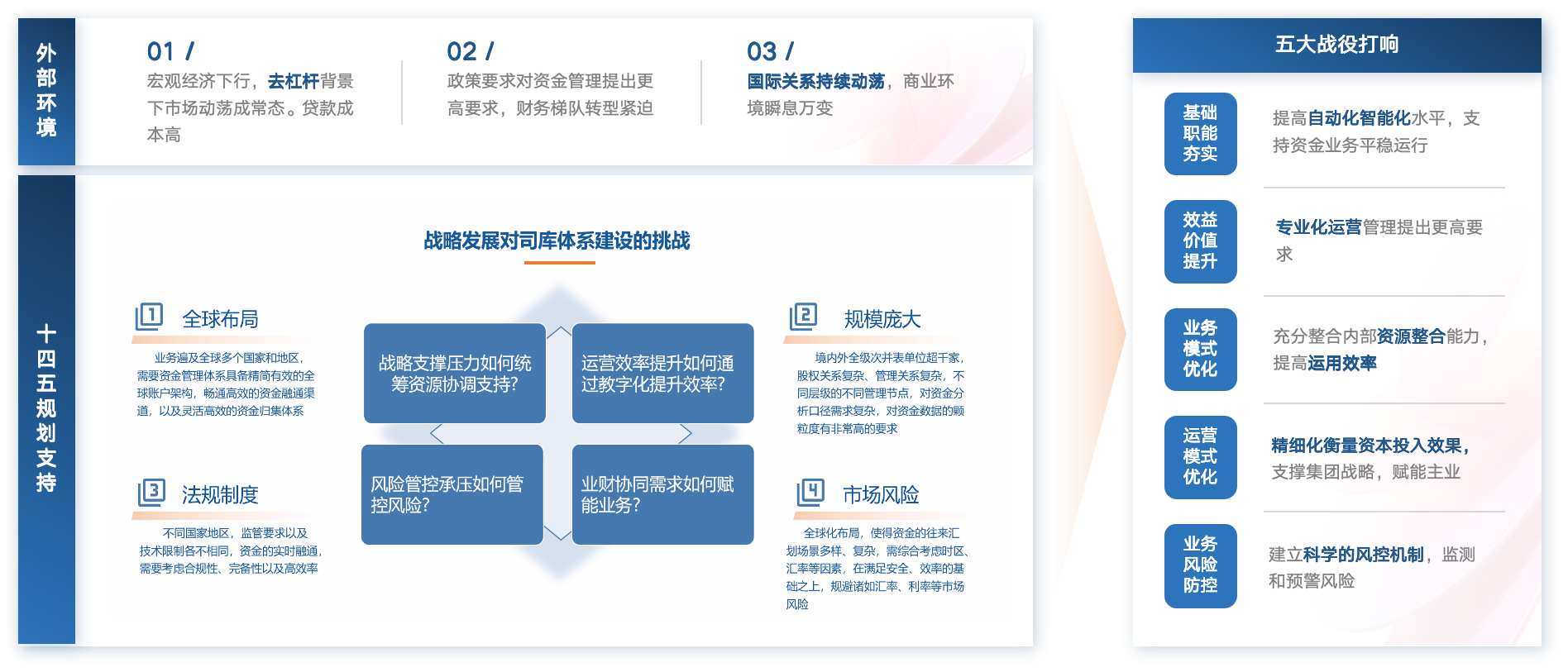 从资金管理到司库管理 资金发展经历了可见、可控、可优化、可预测四个阶段。如今,越来越多企业开始把财资管理放到“大的司库管理框架”之内进行审视和管理,在经济全球化、互联网+、数字化转型的大背景下,企业的资金管理发生着变革和拓展。资金管理已经从最开始的基础资金管理发展到资金集中管控时代,再到现在的司库时代,企业的财资管理已经不是在后台,而是成为企业最重要的战略支撑。未来集团企业将以全球司库的管理理念,构建企业资金管理体系,统筹金融资源,实现资金高效运作、安全防控、精益管理。